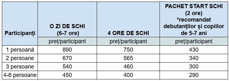 - Prețul cursurilor nu include închirierea echipamentului de schi și contravaloarea transportului pe cablu pentru cursant.